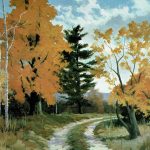 Se deja que se sequen las colinas, pintándose a continuación los árboles con verde inglés y tierra de siena tostada avivando el color aquí y allá con un poco de rojo de cadmio o naranja